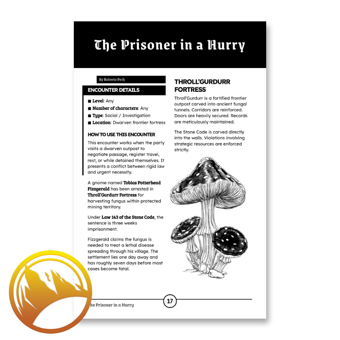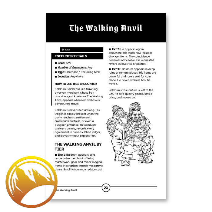 Adaptable Encounters: Dwarven Holds is a collection of ready-to-play encounters for adventures in dwarven strongholds carved into living stone. A tense audience with a thane, a patrol that tests outsiders, a market where every discount is a favor, these encounters give you the tools to make the hold feel proud, pressured, and alive.