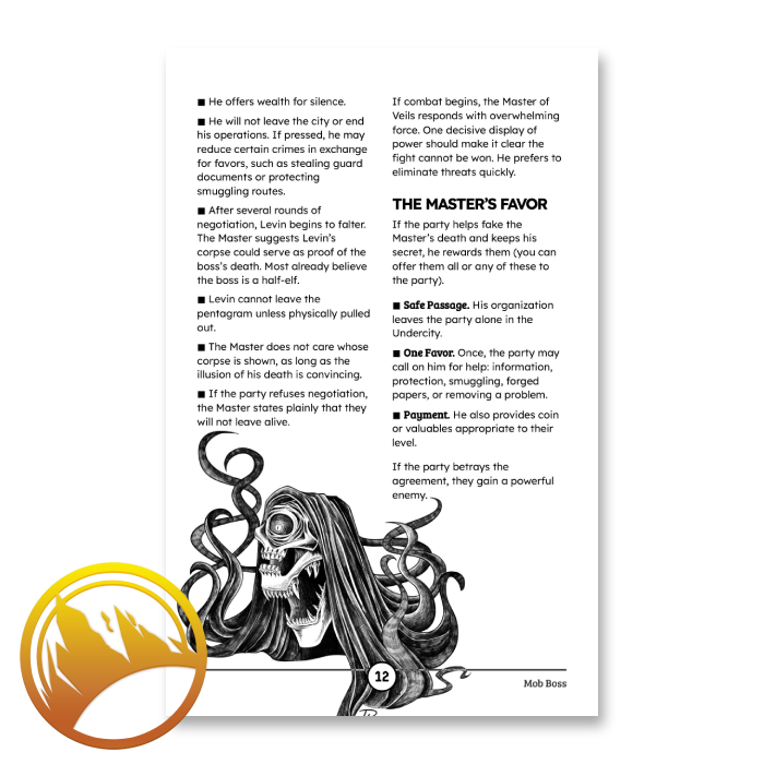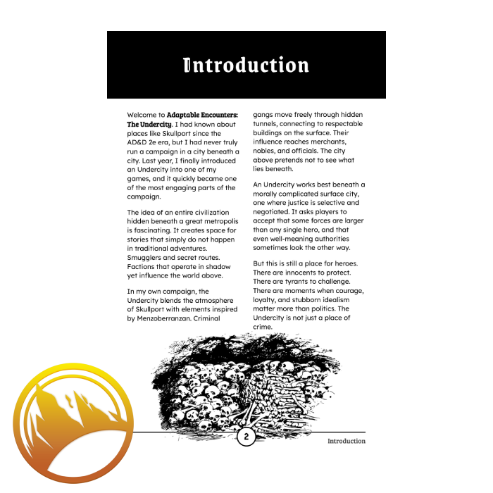 Adaptable Encounters: The Undercity is a collection of ready-to-play encounters for campaigns that venture beneath the streets into a city that should not exist. Drop a single scene into any adventure when you want the world to feel darker and more complicated. A crooked auction, a guide who sells you out, a meeting in a soundless alley, a chase over black water, and the constant pressure of factions that know the tunnels better than you ever will.