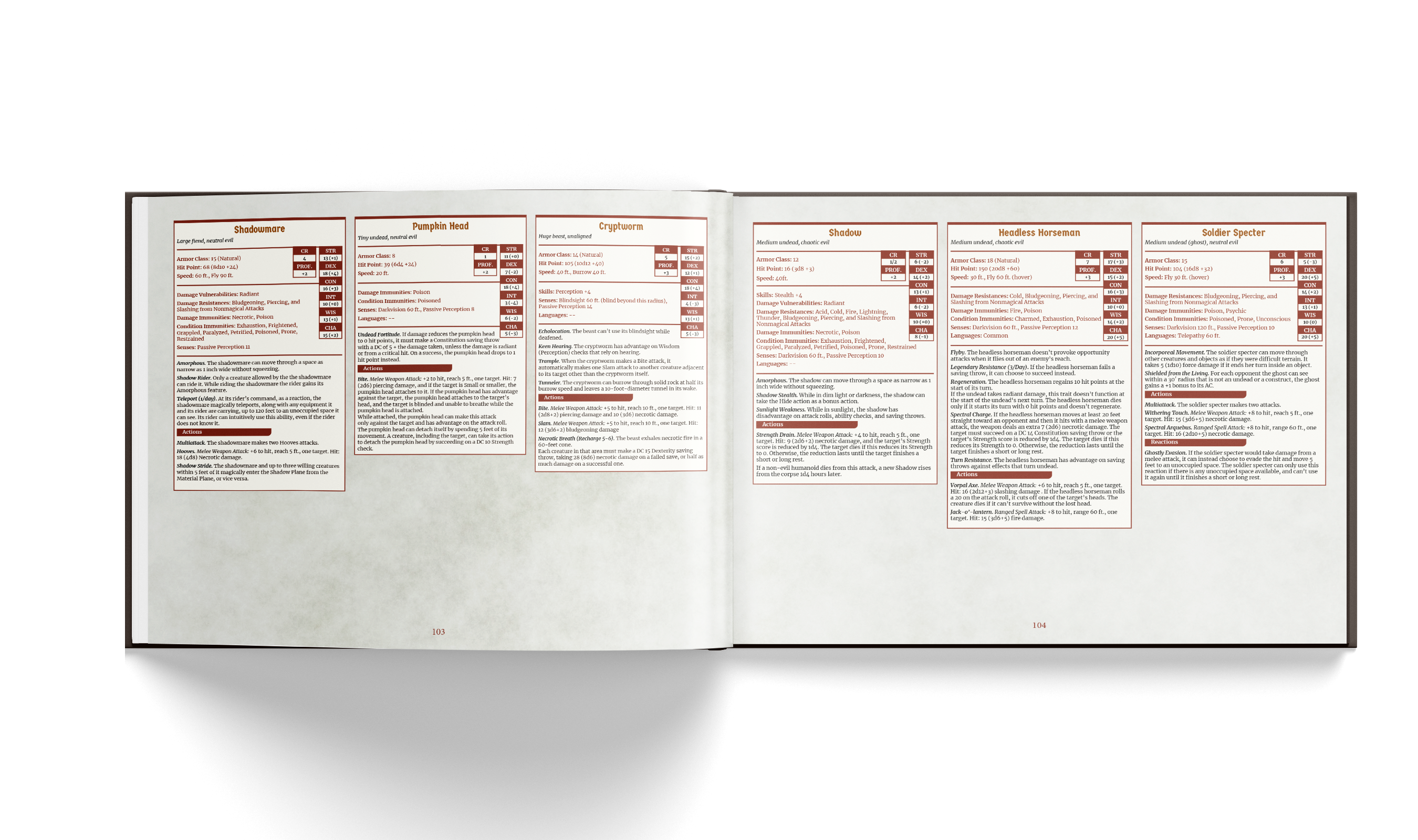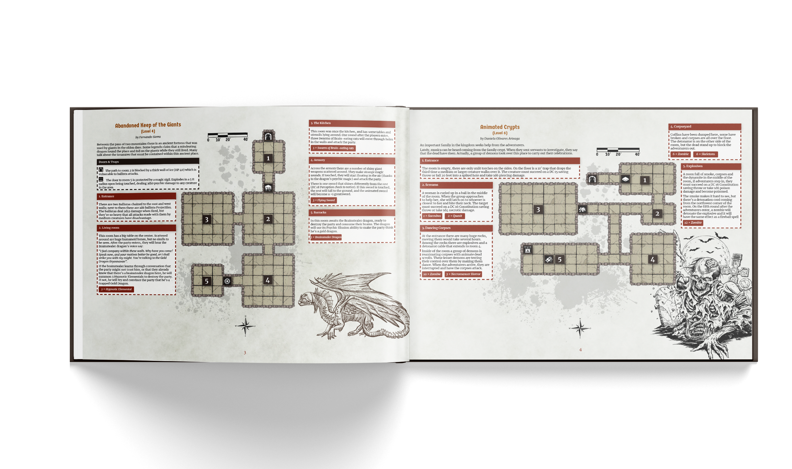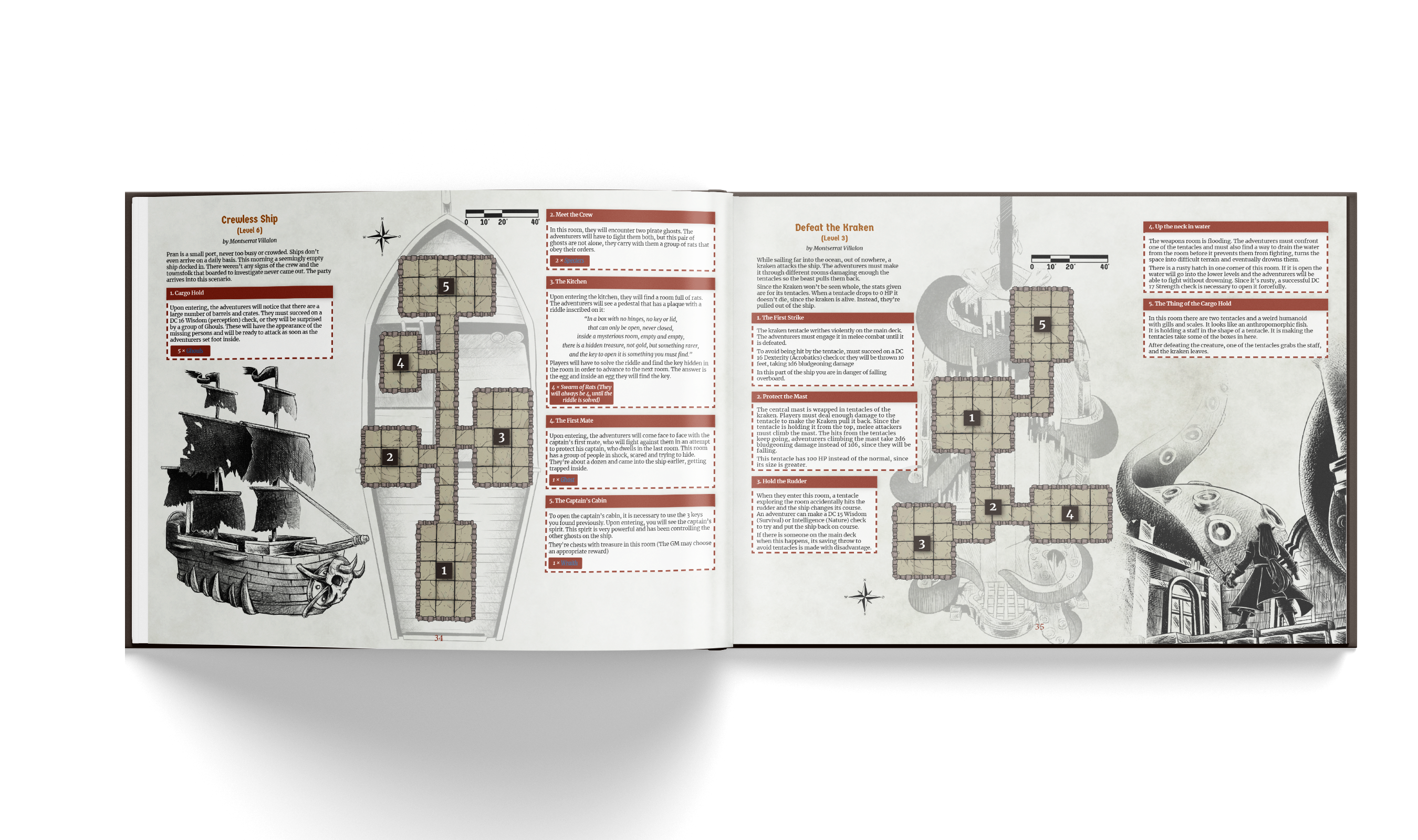 New Monsters. Every dungeon includes at least one new monster. At the end of the document there is an appendix with all the stat blocks for the new monsters. - Also, we add a small black and white drawing on each dungeon to illustrate part of it. In some of the dungeons these illustrations are more prominent, because these dungeons take place in uncommon places, like the interior of a giant worm, or on a boat during a kraken attack, etc.